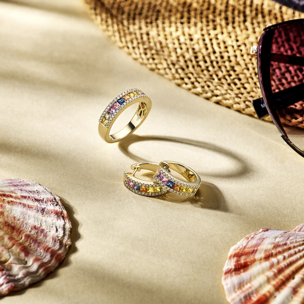 gouden ring,  regenboog saffier+0.30ct briljant mt54
