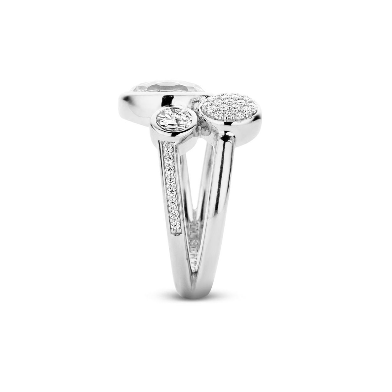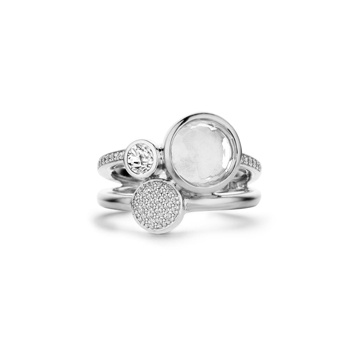 Hoe meer hoe beter. Deze ring maakt indruk door haar combinatie van verschillende vormen en texturen. Met wit zirkonia dat het zilver accentueert voor een verfijnde look.