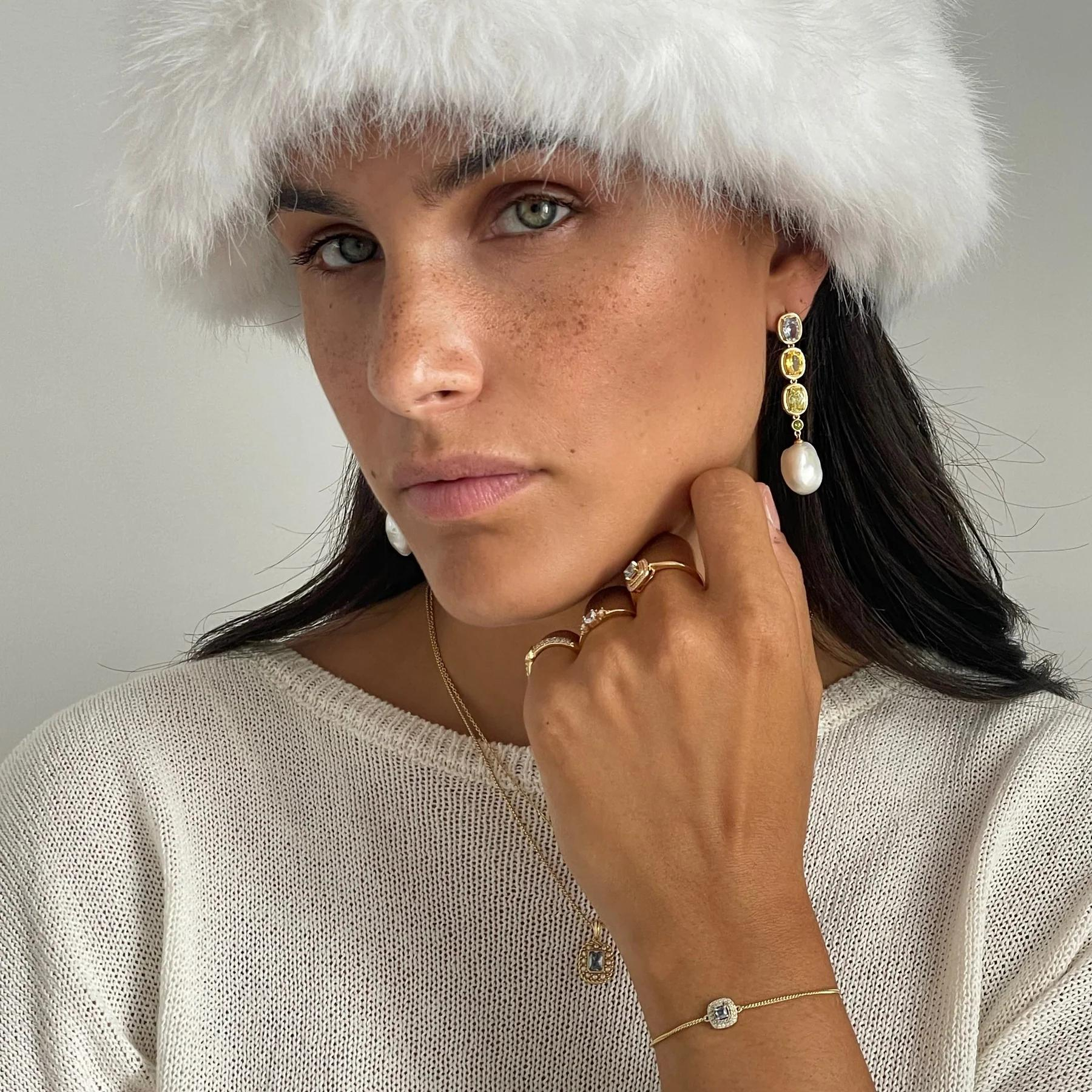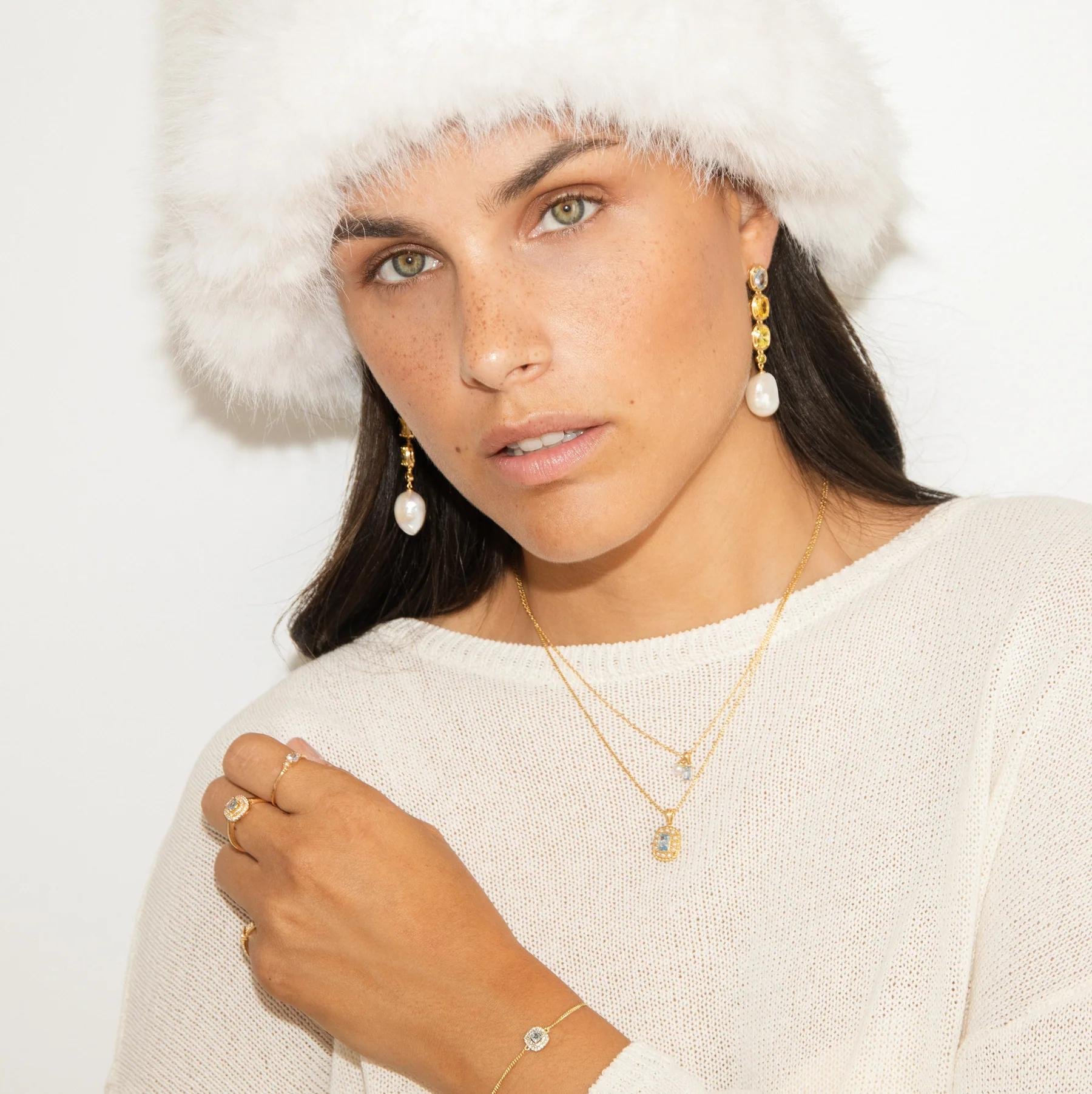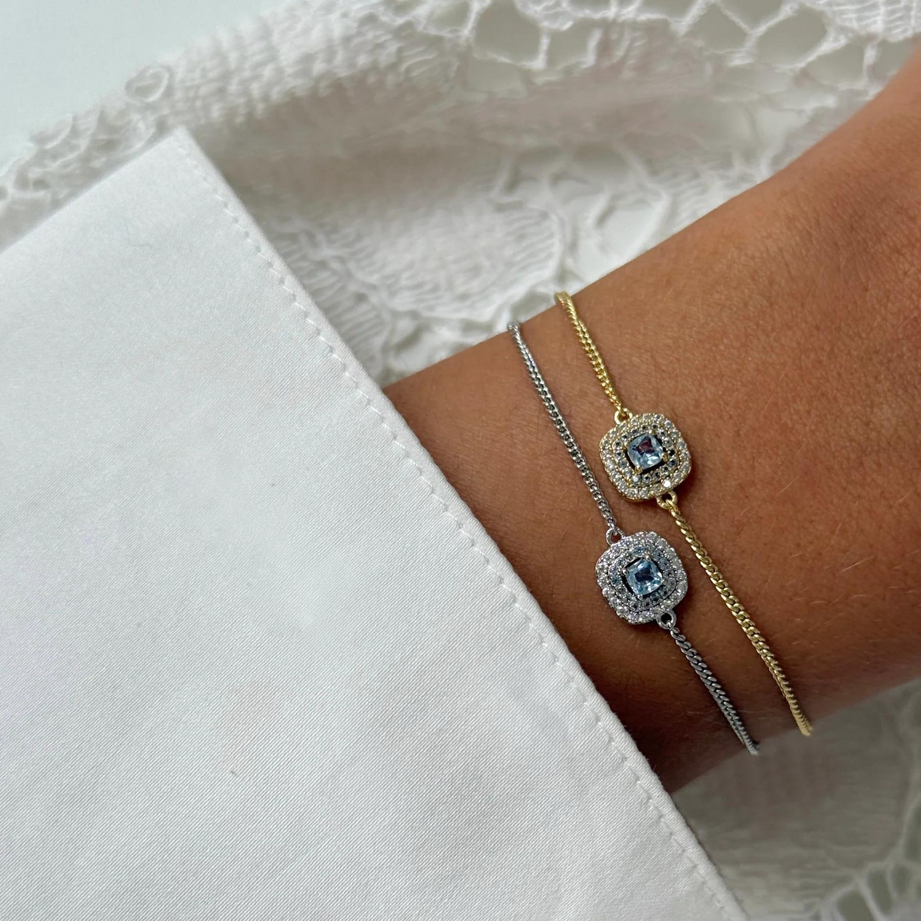 zilveren 24Kae armband, verguld vierkant+ blauw/wit cz
