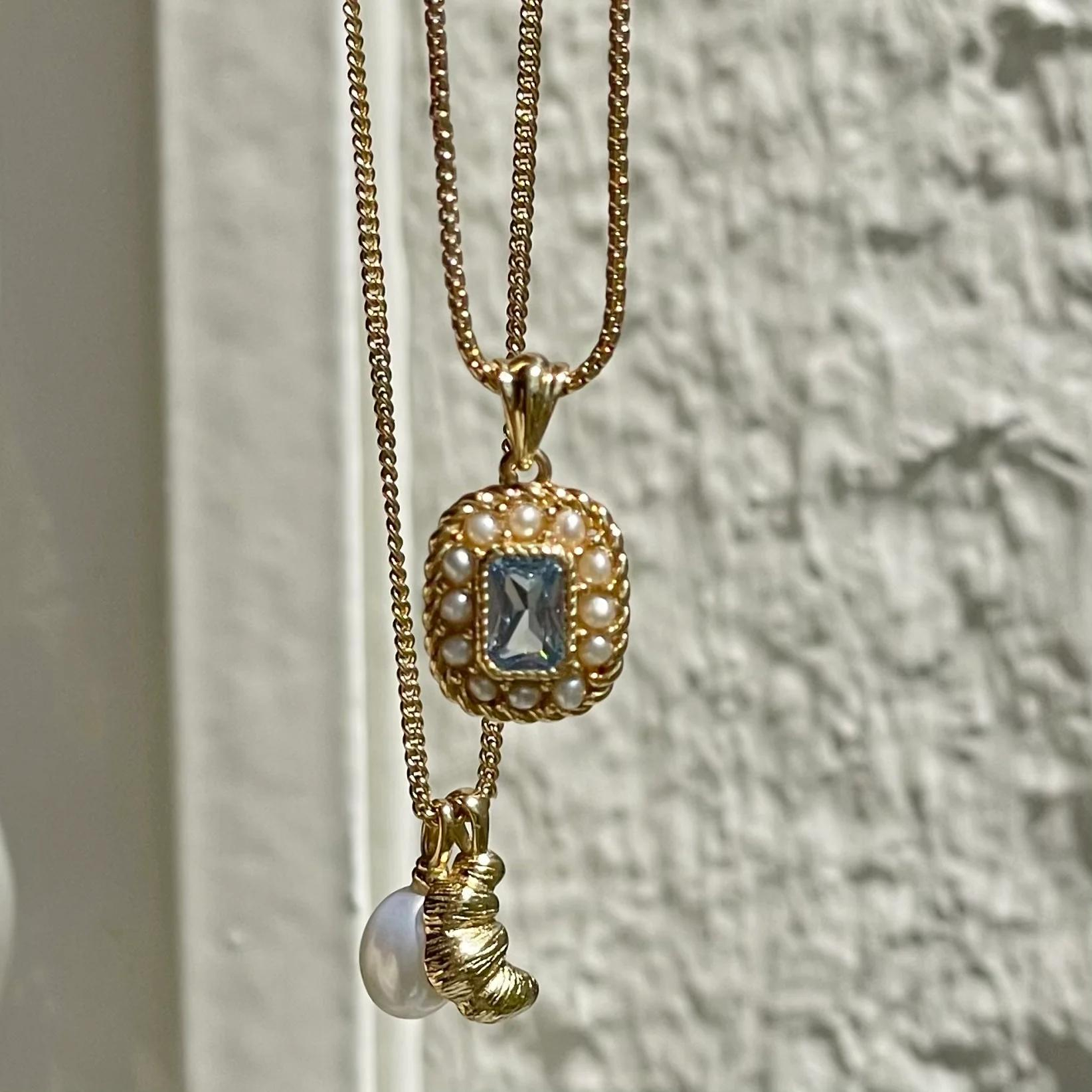 zilveren 24Kae collier, verguld+ rechthoek parels/blauw cz
