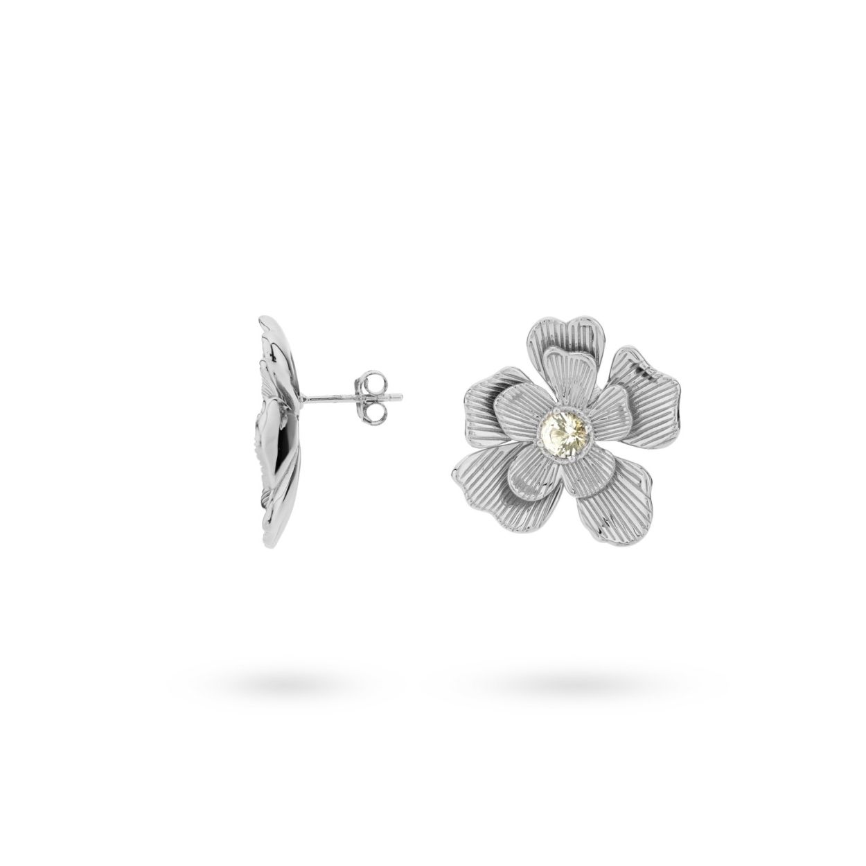 Deze bloemen oorbellen zijn echte statement oorbellen. Midden in de bloem zit een rond groen steentje. De oorbellen zijn gemaakt van 925 sterling zilver gerodineerd. Elk 24Kae sieraad is met liefde en oog voor detail ontworpen door Kae Sutherland.