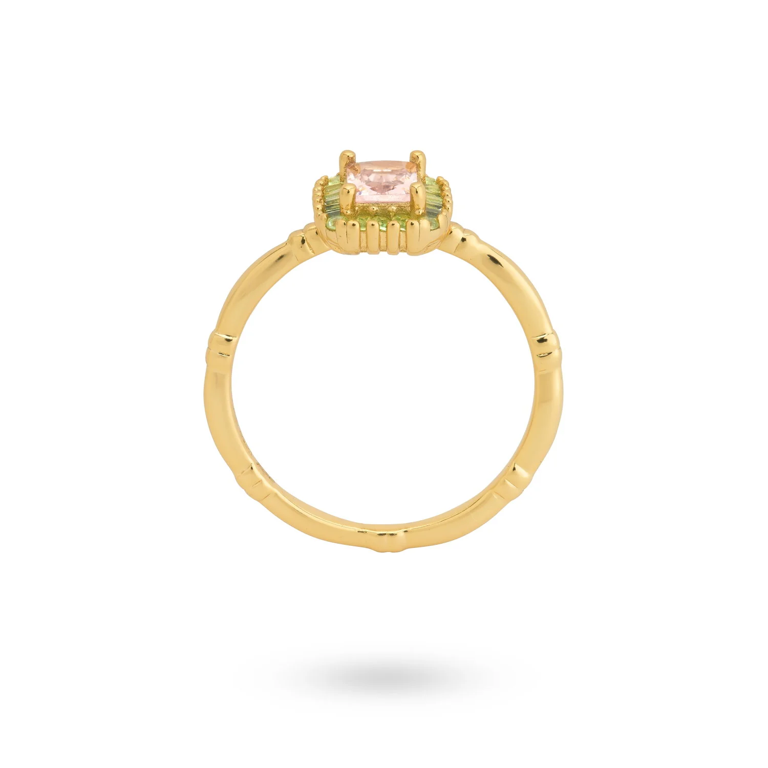 zilveren 24Kae ring, verguld+ rechthoek roze/groen cz